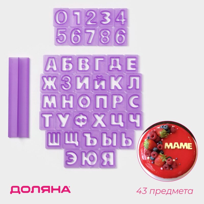 Печати для теста и мастики Доляна «Алфавит русский, цифры», набор 43 шт (3 см), держатель, фиолетовые