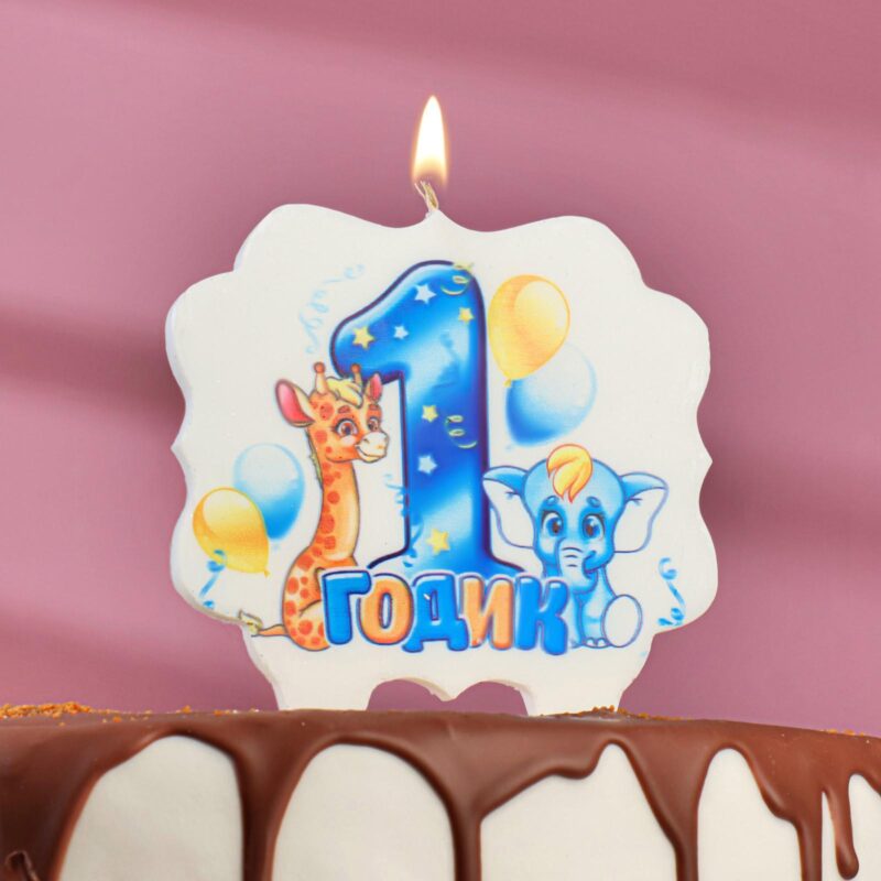 Свеча для торта цифра «1 годик, зверушки» 1 синяя, 8 см