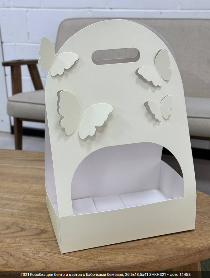 Коробка для бенто и цветов с бабочками кремовая, 26,5х18,5х41